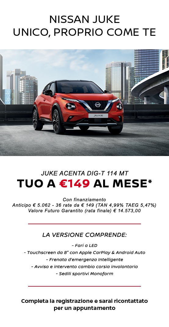 *Nissan Juke Acenta DIG-T 114 a € 21.750 prezzo chiavi in mano (IPT e contributo Pneumatici Fuori Uso esclusi). Listino € 24.700 (IPT escl.) meno € 2.950 IVA incl. grazie al contributo Nissan e delle Concessionarie Nissan che partecipano all’iniziativa a fronte del ritiro, in permuta o rottamazione, di un'autovettura usata con anzianità superiore a 10 anni (e di proprietà del cliente da almeno 6 mesi alla data del contratto del veicolo nuovo).